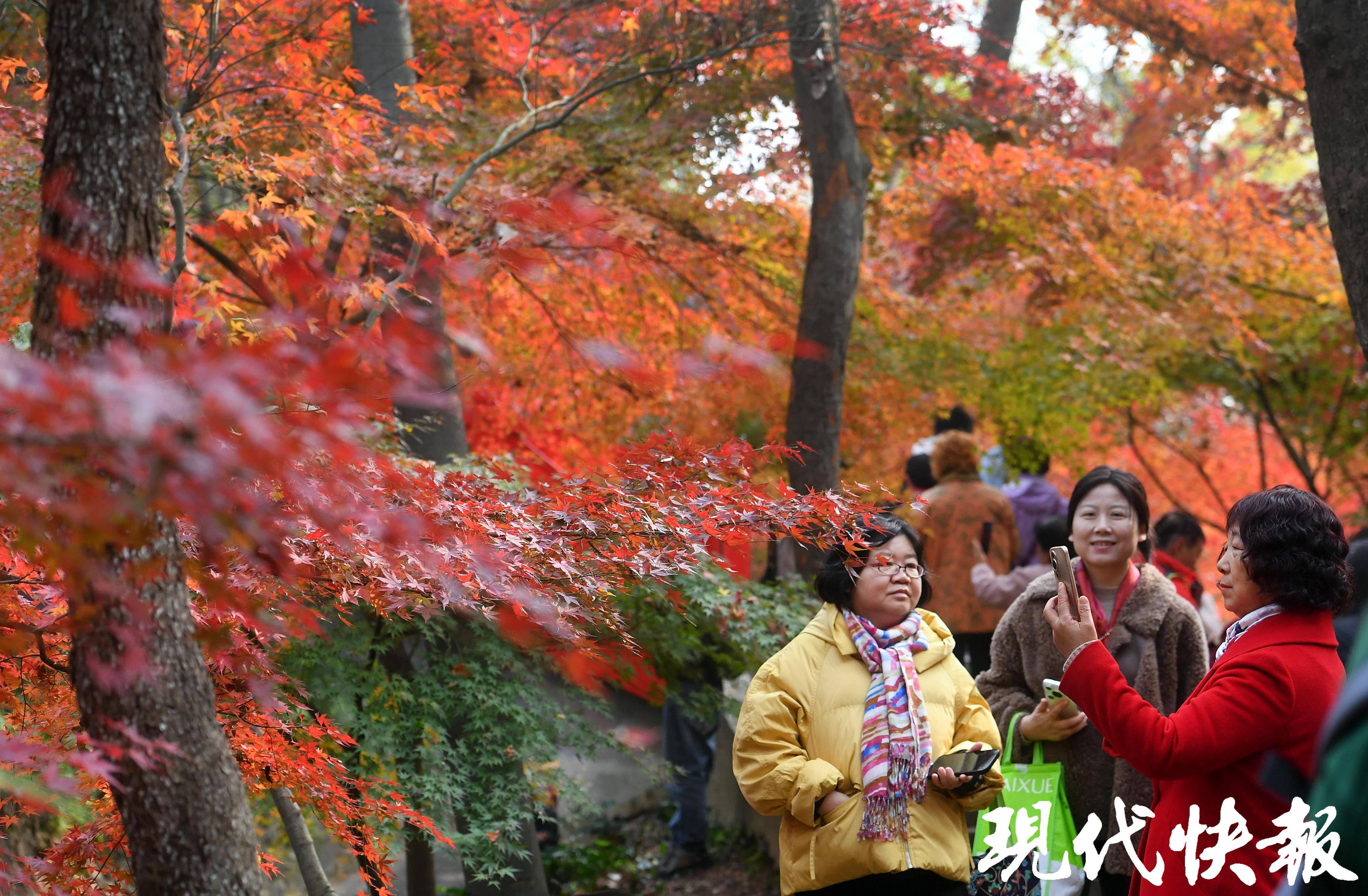 在中山植物园北园的红枫岗内,枫红似火,壮丽的“枫”景引市民游客流连忘返。据园方工作人员介绍,总面积约5000平方米的红枫岗今年新增了约旦、女神、女精灵、羽衣、燕焕、黄八丈等槭树品种,现收集、保存槭属植物100余种,是南京地区红叶种类较为丰富、景观颇具特色的赏红叶景点。