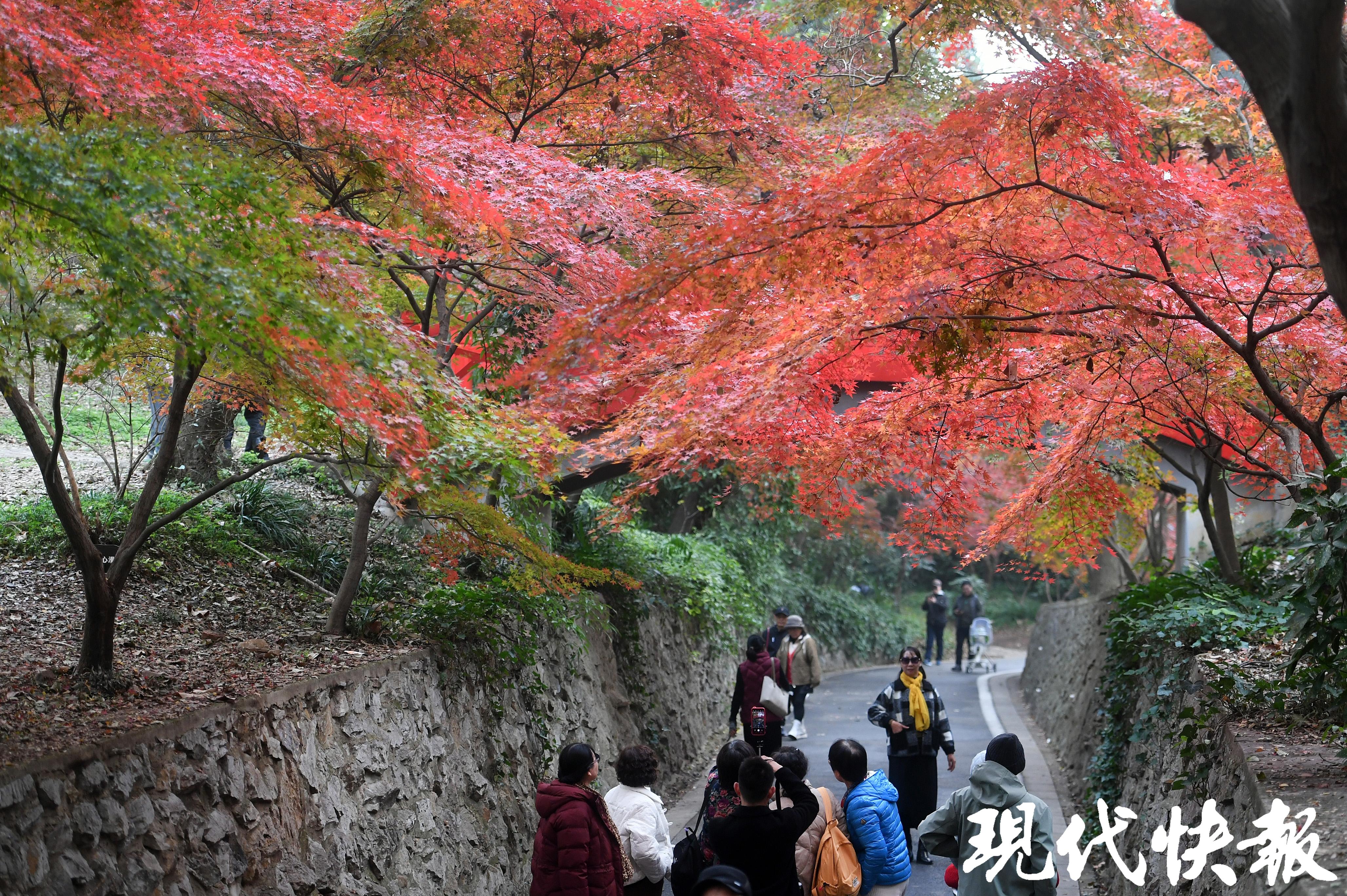 现代快报讯(记者 张然/文 施向辉/摄)小雪节气已过,寒意渐浓,南京中山植物园也迎来了观枫的最好时节。一丛丛曾经鲜绿的叶片,在冬日里寒风与雨露的吹打下,也悄然变脸,火红、橙红、绛紫、明黄、浅绿……枝叶层叠,在阳光下呈现出迷人色彩,将暮秋初冬的氛围感拉满。